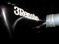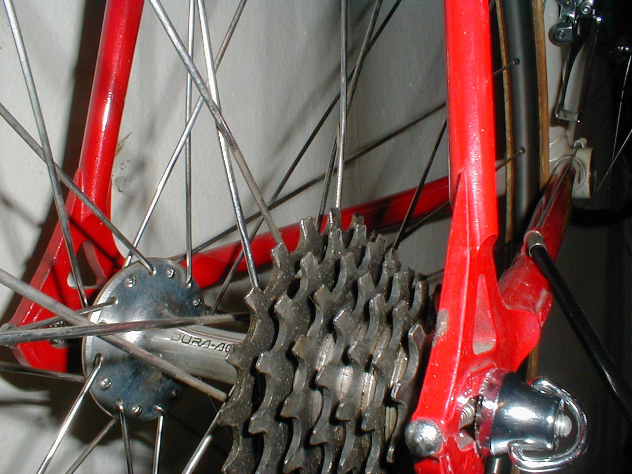 it's now pretty well complete - i managed to accumulate a mixed shimano dura-ace 7400/7401/7402 (7sp index, circa 1987 or so) "gruppo", with 180mm cranks, 12-21 freewheel, 54/42 chainwheels, araya aero-1 tubulars (28/32h), nitto "3rensho" pantographed stem and "aerodynamics" tt bars - and then the oddbal strong seatpost (the dura-ace one was just too blasted short) and a selle san marco concor saddle, cause i just like those, and they're nice to push against with a low-profile frame like this. tires are 24"/700c x 15mm!!! it's actually *way* more comfortable to ride than one might expect, despite more than a foot drop from seat to bars, and it goes like stink. definitely a smooth, clean pavement bike...