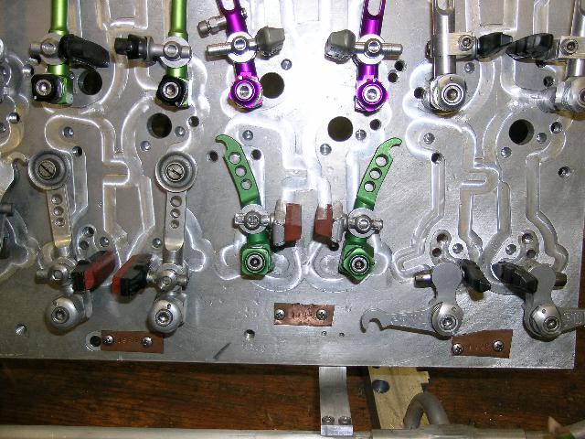 The funny looking black one [2nd from top left corner] was the precursor to the Crosstop. housing ended at the top of the arm and the cable continued on down and into a hole in the bottom of that cam thing. There was a cable clamp that fit in the round recess. Then there was a short cable that went from the top of that cam thing to the other arm, round cable clamps on both ends. It worked ok but when I saw the IRD version I knew it was better. I called them up (Rod and Ray) and asked if they would pissed if I did a similar version. We've been friends ever since. (A side note-Syncros toured their shop and then promptly ripped off their seat post design-without asking the same question-they are not friends.)