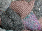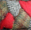 an unfortunate combo with the aforementioned rust/brown/white fabric and some blue/white harris tweed results in an american flag-esque bit. erk. i do like the texture of the harris tweed, though. red enters the picture, and this nice dark grey/green stripey fabric, which doesnt show up that well.