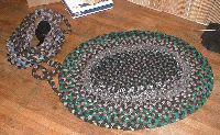 succumbed and bought a yard of green fabric, cause material of that color wasnt popping up in the thrift stores. at first the green looked to be a bit bright, but mellows out when surrounded by other colors (see below). braided a whole ton of fabric over the thanksgiving weekend. nice blue/black and grey/purple plaids at an out-of-town thrift store, and some more harris tweed, grey herringbone and brown/white. alos a nice deep rust/grey/black plaid, and nice olive and red-brown solids.