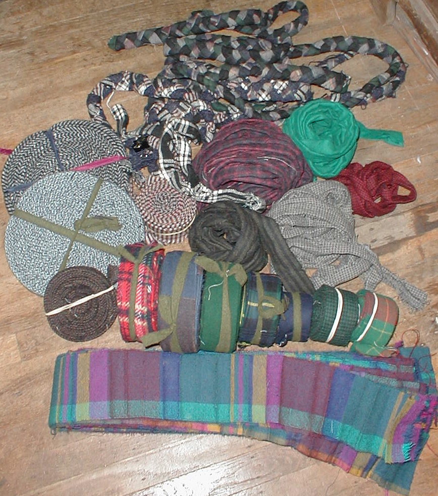 the big open space in the middle of my room has needed a rug for a while, so i decided, true to form, that id make one myself. being a sucker for "recycling" of sorts, and for old-fashioned things, i chose to make a braided rug out of whatever woolen fabrics i could scrounge up from thrift stores and whatnot. some people like to approach these with an eye for color combinations and whatnot - me, i prefer the random approach - whatever i find is whatever color things end up being.
