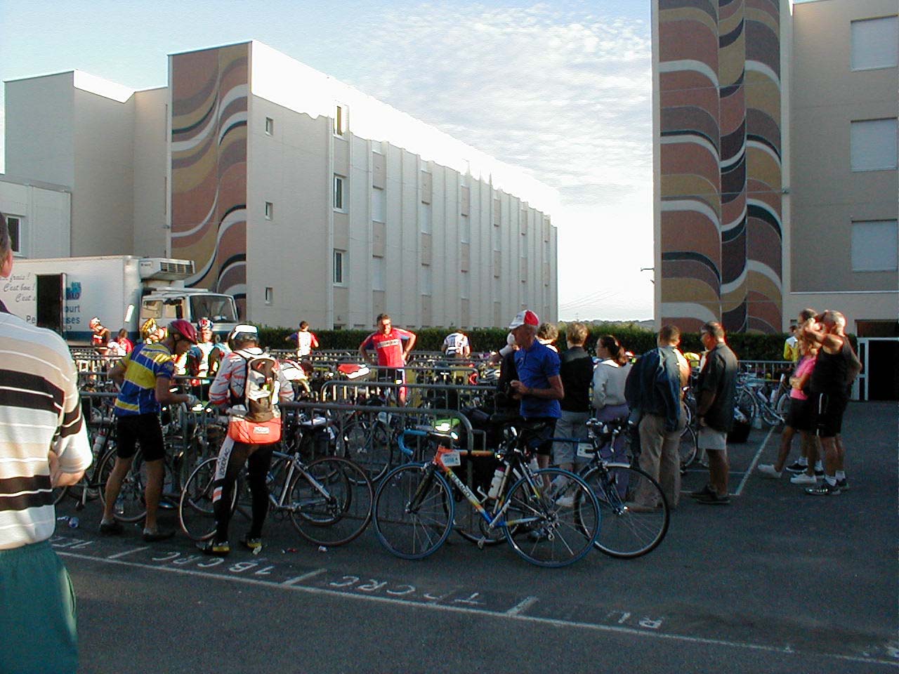 The day before, I'd gone through check-in, running into Kathleen, Ginger, Chris, and Darryl from SF, and Simon and Pat from Philly - my little crew of sorts... That is to say, The People I Knew. Chris had just rolled in from the airport, and had his bike bag all laid out, figuring on camping on the grounds, and was busy asking around for a "lighter". Those crazy Californians... I was nervous about check-in, cause I had some vision of them taking one look at my dirt-encrusted bike (that probably had more torturous miles in less time on it that a good 90% of the bikes there...) and declaring it unfit to ride. Of course, this was totally absurd, cause check-in is actually really cursory. Bike check? Yeah, your lights work, and that reflective vest, it's reflective. Got some strange looks for my punk rock reflective sash, cut-up that it was from pilfered road signs. Hey, I wasn't about to spent any money on something I have no use for, and that is one of the single greatest culprits in the dorkifying of cycle tourists everywhere. No way. Got even stranger looks for my bike, and general attire (BDU shorts and sleeveless t-shirt. Hey, it's what I wear riding every day!). Was mellow, overall. Checked in, got my papers and all that, turned around and headed back in Paris.