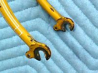 You are bidding on a good used Jack Taylor bicycle frameset made in the UK. Serial number 5009 indicates this bike was made in 1964. Tubing is 531 Reynolds. Seat tube is 22-1/2" or 57cm center to center and 23-1/2" or 59.5cm center to top. Top tube is 23" or 58.5cm center to center. Down tube is 25" or 63.5cm center to center. Head tube is 5-7/8" or 15cm. Seat stays are 22" or 56cm center to axle. Chainstays are 17-3/4" or 45cm center to axle. Axle width is 125mm but flex in the frame will allow 5mm play + or - here. Unmarked headset and brake hangers included. Frame and fork are straight. No dents or dings. Paint shows its age with quite a lot of chips and scratches. Some decals are quite scratched and others are missing entirely but in my opinion it is too nice to repaint