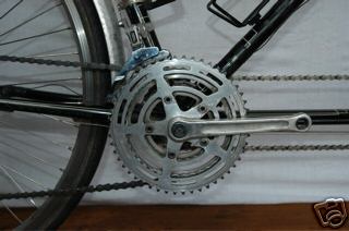 1977 Jack Taylor tandem; Reynolds 531 butted tubing. Original black paint w/box striping. Captain's size - 23 inch; Stoker's 22 inch. 21 speed, New Campy rear derailleur, new Suntour front derailleur, Shimano bar end shifters. 700C Mavic rims w/ Phil Wood hubs. Dia Compe brakes. Shimano disk brake on rear. Original Stronglight crank. Lots of other original equipment in place (lights, generator, retro aluminum fenders, racks) Sale includes original Campy Record derailleurs and additional Stronglight chainwheels. Condition: good. Includes normal dings and scratches. Rear lamp lens chipped. Wiring from generator to front and rear lights removed when bike wheels converted from 27 inch to 700 C.
